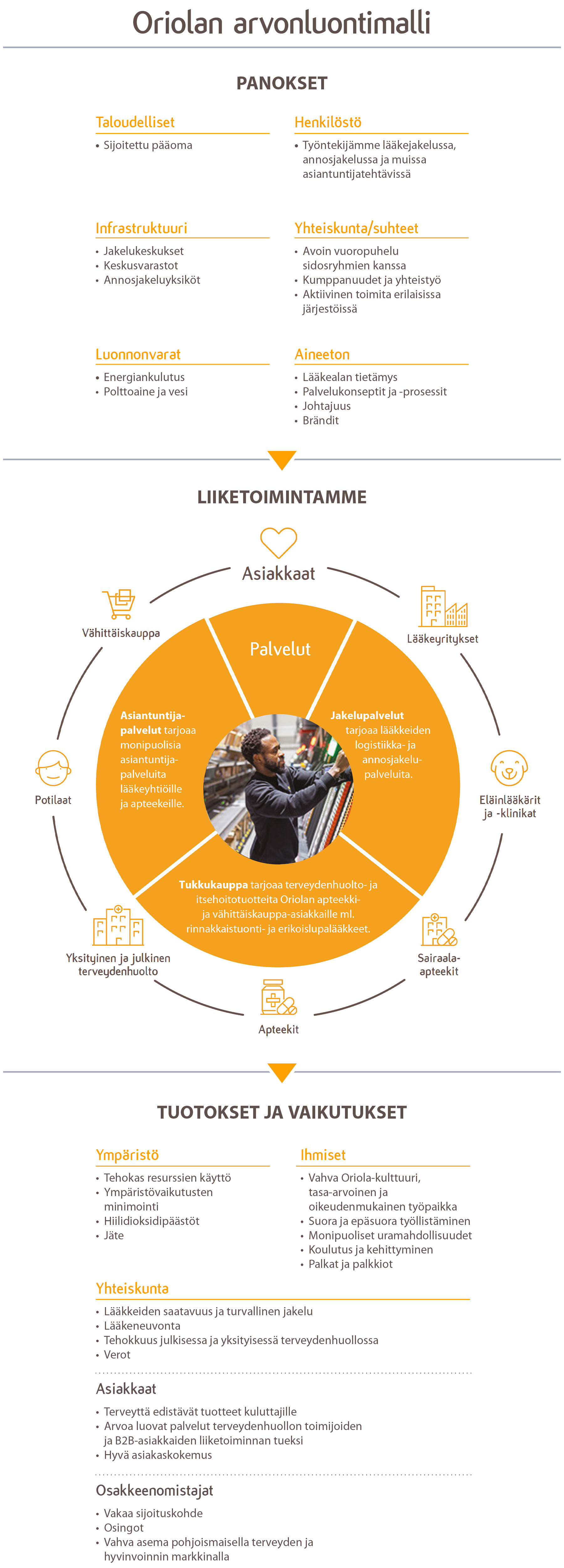 Tuotteemme ja palvelumme tuottavat arvoa erilaisille sidosryhmille kumppaneista ja työntekijöistä asiakkaisiin ja osakkeenomistajiin. Oriolalla on vahva asema Suomen ja Ruotsin terveyden ja hyvinvoinnin markkinoilla. Potilastuki- ja annosjakelupalvelumme tukevat lääkkeiden turvallista käyttöä. Kattava terveys- ja hyvinvointituotteiden valikoimamme tukee terveyttä elämän eri vaiheissa.