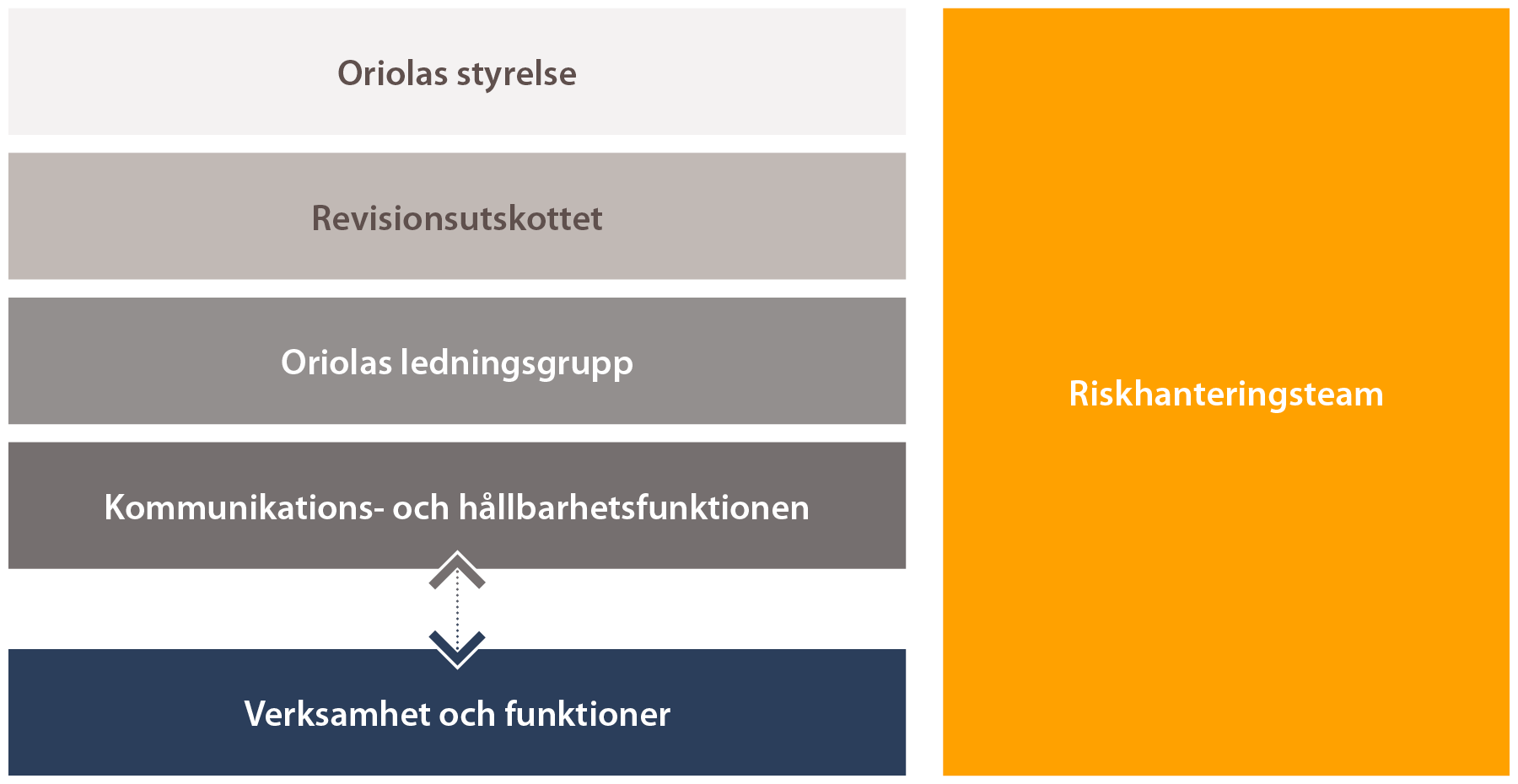 VD och ledningsgruppen har det övergripande ansvaret för att genomföra Oriolas hållbarhetsagenda som en del av strategin. Förbereder och följer upp koncernens hållbarhetsagenda inklusive handlingsplaner, risker, mål och prestationsindikatorer. Godkänner de relevanta policydokument.